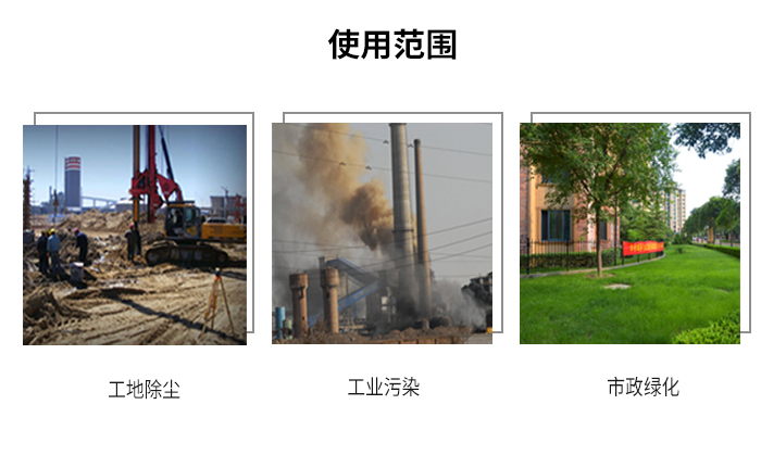 揚(yáng)塵污染治理:適用于對(duì)煤礦行業(yè)、化工行業(yè)、發(fā)電行業(yè)、建筑拆遷、工地施工等容易產(chǎn)生揚(yáng)塵污染的場所進(jìn)行抑塵、降塵治理;
