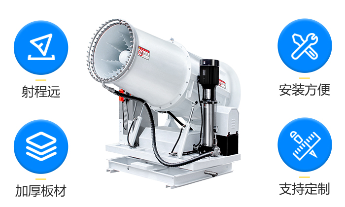 | 型號 | 靜風(fēng)射程 (m) | 風(fēng)機(jī)功率(Kw) | 水泵功率 (Kw) | 總功率(Kw) | 俯仰角度 (常規(guī)) | 旋轉(zhuǎn)角度 | 噴頭數(shù)量 | 20米處噪音 (dB) | 箱體重量 (kg) | ||