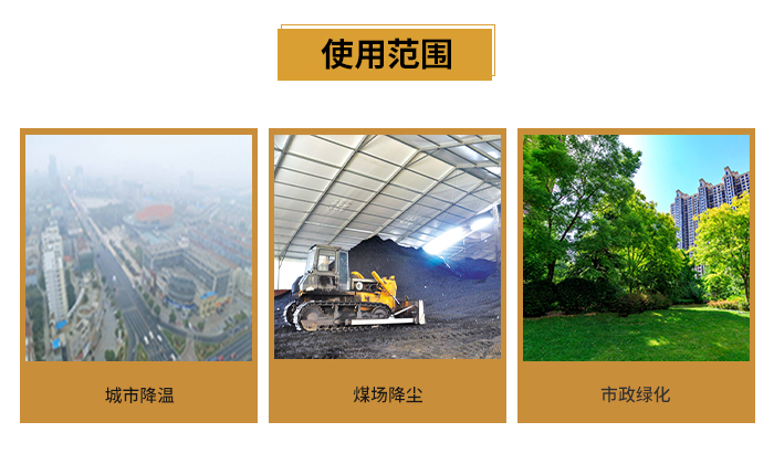 除塵范圍:粉塵治理、露天物料堆場(chǎng)、煤炭物流園區(qū)、露天礦山開采、露天爆破粉塵、封閉卸料區(qū)、卡車卸料口、自卸車卸料粉塵、大型裝載車工作粉塵、沿海港口裝運(yùn)、轉(zhuǎn)運(yùn)煤炭、礦石、散裝粉料搬運(yùn)等粉塵污染治理;保濕降溫:飛機(jī)場(chǎng)、高速公路、車站、碼頭、公共場(chǎng)所、運(yùn)動(dòng)場(chǎng)地、炎熱場(chǎng)地等大范圍降塵保濕降溫消毒;噴藥病害防治:垃圾填埋場(chǎng)、衛(wèi)生防疫、城市園林綠化以及自然災(zāi)害過后大面積的殺菌、消毒、除臭、防疫防治病蟲害等。